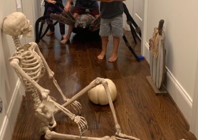 We decorate as a family on October 1st. Along with decorations we pull out all the Halloween books and games. Everyone loves reminiscing over their favorite decorations like the 6 foot giant, woolly spider that hangs on our stairwell and the pumpkin village we created together several years ago.